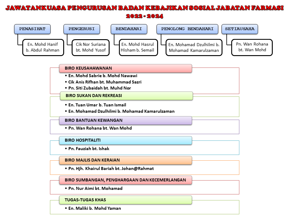 - Membuat laporan jika ada sebarang kematian, masuk wad, bencana alam yang berlaku di kalangan staf Jabatan Farmasi.
